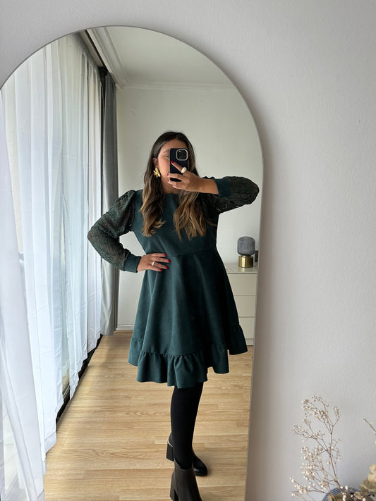 Vestido Lorena Vuelos Manga Larga Encaje Tela Agamuzada